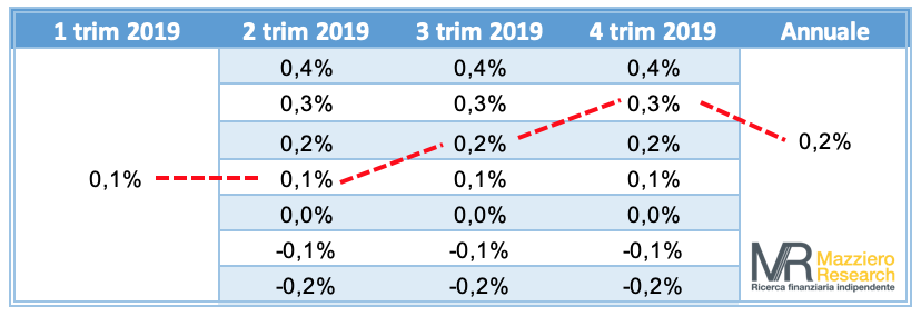 Il PIL al 1° trimestre 2019 è stato abbassato da Istat al +0,1% (era +0,2%). Rivediamo le stime di crescita annuale al +0,2% (dal precedente +0,4%).
